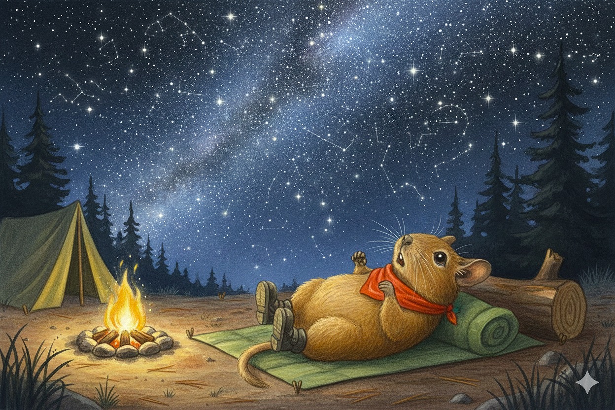 第8章 現存しない星の瞬き 2025年11月22日 その夜、こむぎは八幡平のキャンプ場にテントを張った。 夏休みにはまだ早く、敷地内に人影はほとんどない。 風の音と、遠くで鳴く虫の声だけが、広い空間に溶けていた。