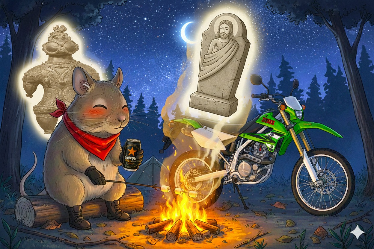こむぎは缶を置き、ゆっくりとテントに潜り込んだ。焚き火の残光が幕越しに揺れ、やがて夢と現実の境界を溶かしていった。