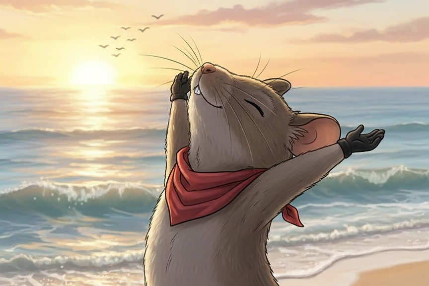 海の香りが潮風に乗って鼻をくすぐる。テントの外では、カモメが啼く声が聞こえていた。こむぎは寝袋から這い出し、大きく伸びをした。