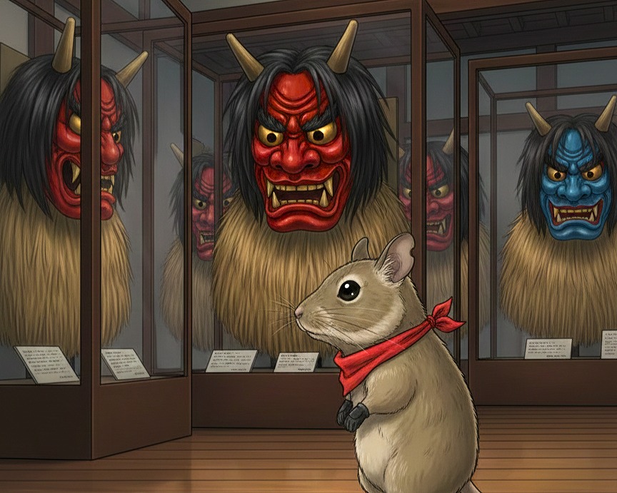 なまはげ。鬼のような面に藁の衣装をまとい、家々を巡って悪い子を探す異様な存在。その印象は"奇習"と一言で片付けられがちだが、こむぎの目には、その背後にある何かが、強く、そして不気味に映っていた。