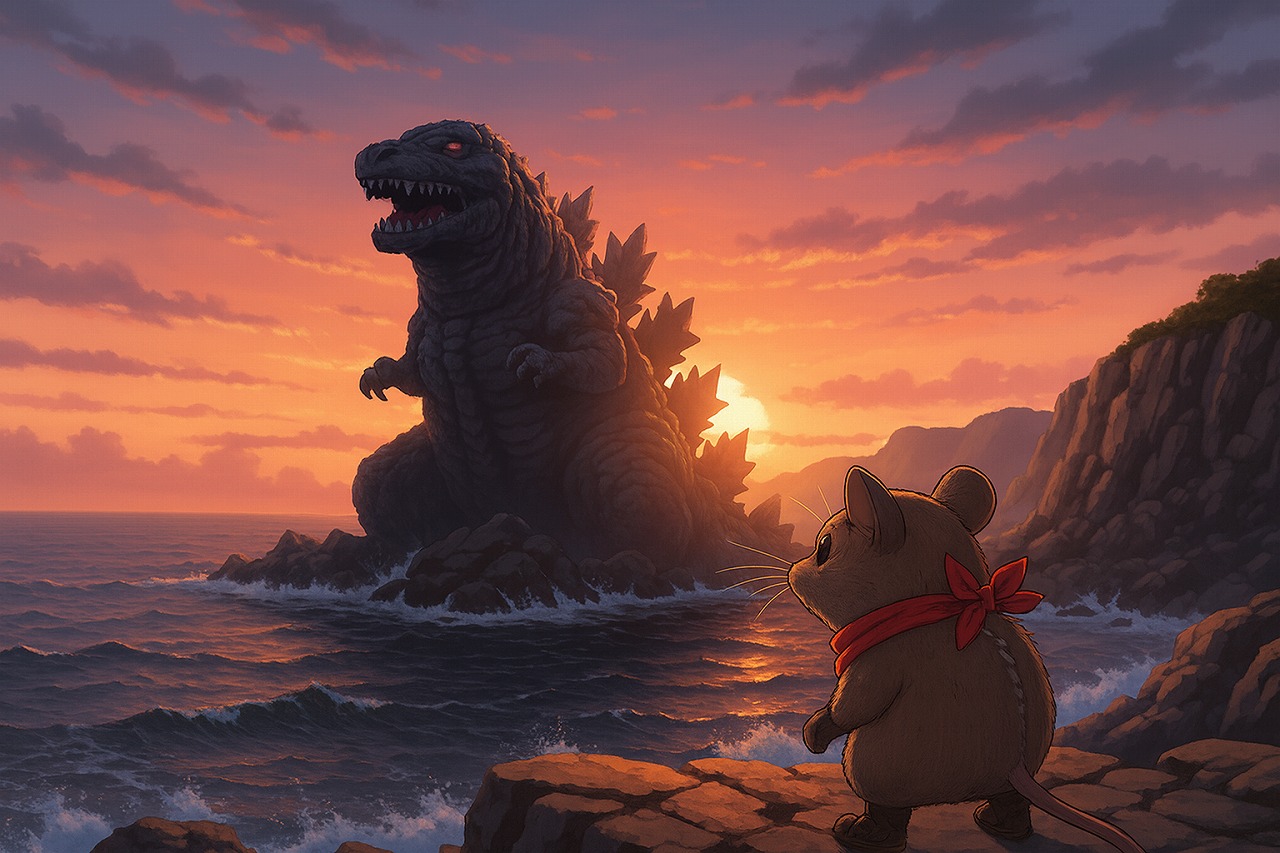 その後、こむぎは「ゴジラ岩」に立ち寄った。名前の通り、巨大なゴジラの横顔に見える奇岩。夕陽が差し込むと、まるで火を吹くように見えるというが――こむぎの目には、それ以上のものが映った。
