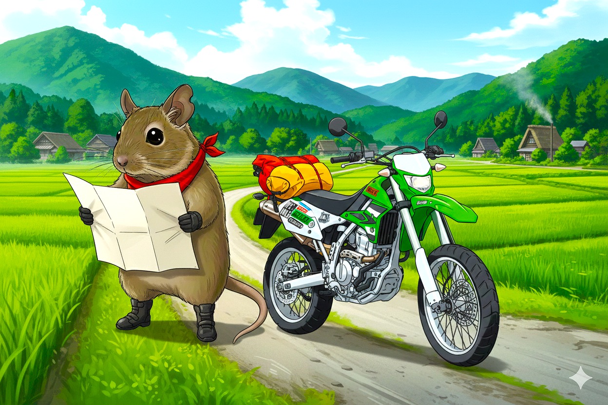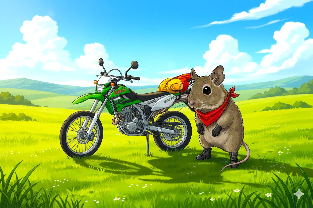 広大な平野のなかに、一筋のアスファルトがまっすぐ続いている。こむぎはその路肩にバイクを停め、エンジンを切った。カワサキKLX250は、今日もよく走ってくれた。ライムグリーンの車体に積もった虫の残骸と長旅の埃。それをタンクの上で指先ですっと払うと、ふぅと小さく息を吐いた。