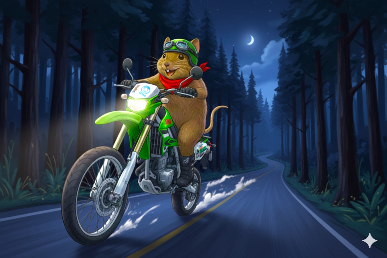 空はすでに完全な夜の色。群青から濃紺へ、そして闇へ。遠くで虫の声が鳴き、星がひとつ、またひとつと顔を出していく。バイクのエンジンに火を入れる。深く、静かに唸る音。ハンドルを握る手に迷いはなかった。